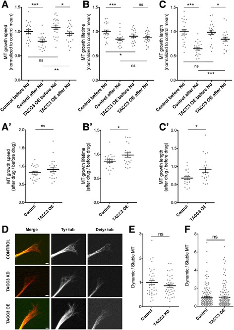 Fig. 2. TACC3 antagonizes Nocodazole-induced MT depolymerization but does not affect MT stability. a-c, Quantification of the MT dynamics shows significant reduction in MT growth speed (a), MT lifetime (b) and MT growth length (c) in control (nâ=â22) and TACC3 OE (nâ=â21) growth cones in response to 50 pM Nocodazole before and 5 min after drug treatment. However, the effect of Nocodazole on TACC3 OE growth cones is dampened compared to controls. aâ-câ, Although not significant, reduction in MT growth speed (aâ) is more prominent in control growth cones compared to TACC3 OE growth cones while the reduction in both lifetime (bâ) and length (câ) in control growth cones are significantly higher than the TACC3 OE growth cones (d) Representative growth cone images of control, TACC3 KD and TACC3 OE, immunostained for tyrosinated tubulin (red) and detyrosinated tubulin (green) to label dynamic versus stable MTs, respectively. e-f, Quantification of the fluorescence intensity of imaging data in G, with TACC3 KD (nâ=â38) (e) and TACC3 OE (nâ=â129) (f) growth cones showing no significant changes in dynamic/stable MTs compared to corresponding control growth cones (nâ=â37 and n =143, respectively). *pâ<â0.05, **pâ<â0.01, ***pâ<â0.001. ns not significant. nâ=âgrowth cone number. Scale bar, 2 μm