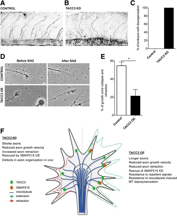 RESULTS: Here, we show that TACC3 is required to promote persistent axon outgrowth and prevent spontaneous axon retractions in embryonic Xenopus laevis neurons. We also show that overexpressing TACC3 can counteract the depolymerizing effect of low doses of nocodazole, and that TACC3 interacts with MT polymerase XMAP215 to promote axon outgrowth. Moreover, we demonstrate that manipulation of TACC3 levels interferes with the growth cone response to the axon guidance cue Slit2 ex vivo, and that ablation of TACC3 causes pathfinding defects in axons of developing spinal neurons in vivo.
