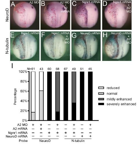 or co-injection of A2 MO mRNA and Akirin2/Ngnr1/NeuroD mRNA on the expression of NeuroD or
