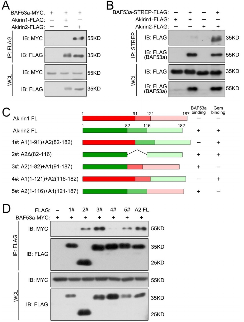 Akirin1-Akirin2 fusion constructs with BAF53a in co-IP experiments. WCL, whole cell lysate; IB,