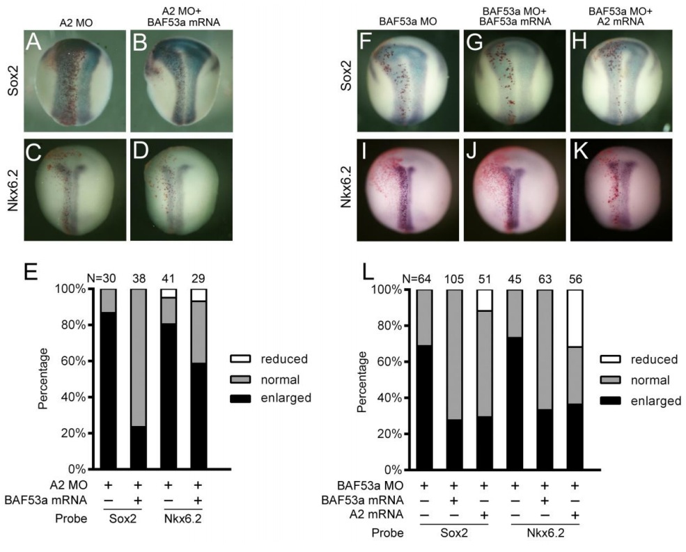 expression of Sox2, Nkx6.2, as shown in (A-D). (F-K) Co-injection with BAF53a mRNA (1.0 ng) or