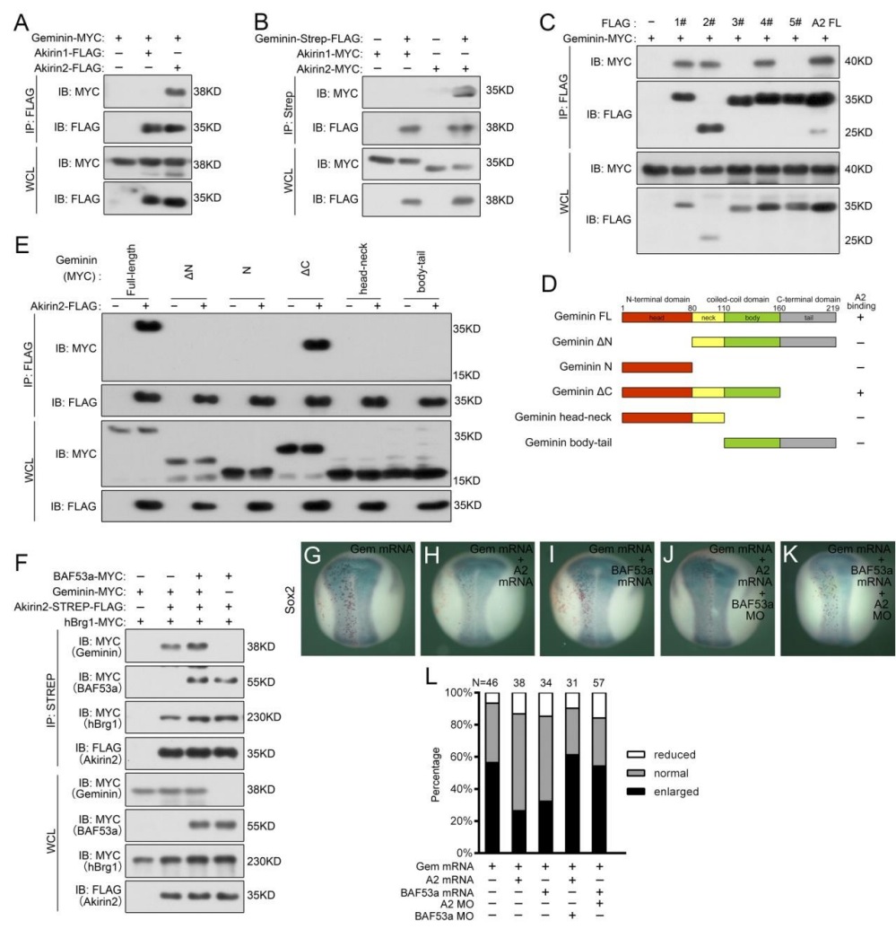 Geminin truncation constructs with Akirin2 in co-IP experiments. (F) BAF53a enhances the interaction of Akirin2 and Geminin. (G-K) Co-injection with either Akirin2 or BAF53a mRNA rescues the expansion of