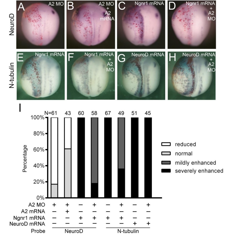 the left sides). (I) Quantification of the effects of the injection of A2 MO, Ngnr1 mRNA, NeuroD mRNA