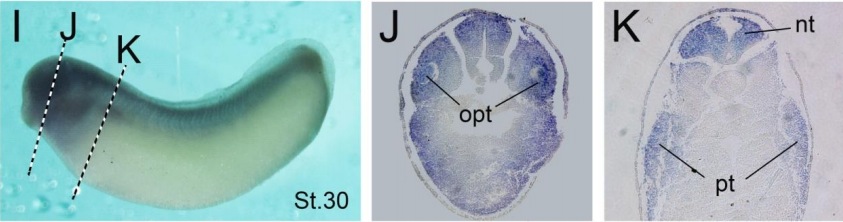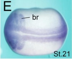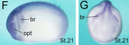 pole to the top). At St.15, Akirin2 is expressed at the neural plate (np) (D, dorsal view). At late neurulation, Akirin2 is most abundant in branchial arches (br) and the optic vesicle (opt) (E, dorsal view;