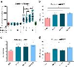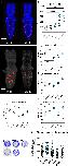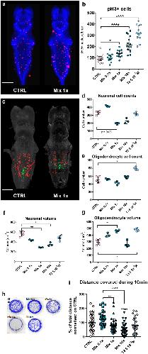 Figure 4. Mixture enhances proliferation in brain, modifies neural cell populations and behaviour.(a) Dorsal views of brains of mixture exposed wild type NF45 X. laevis tadpoles. Immunohistochemistry used the anti-PH3 antibody (red, mitosis) and DAPI (blue, nucleus). Scale bar, 200âμm. (b) Numbers of proliferating cells in (PH3â+âcells) in tadpole brains following mixture exposure. nâ=â13 brains per condition, 5 independent experiments pooled (representative number of positive cells in each brain). Statistics used 2-way ANOVA and Dunnettâs post-test (Mediansâ±âSDs, *pâ<â0.05,****pâ<â0.0001) (c) CLARITY imaging illustrating the region of interest delimited for analysis in (dâg) on hind brain. Examples of control (left) and mix 1x exposed (right) double transgenic tadpoles Tg(nβt:DSRED) (neurons, red) and Tg(Mmu.mbp:NTR-eGFP) (oligodendrocyte, green). Scale bar, 200âμm. (dâg) Quantification of CLARITY signals obtained for each fluorescent signal in hindbrain. Neuron (d) and oligodendrocyte (e) numbers and cell volumes (f,g), nâ=â3 to 5 brains, Statistics used non parametric Kruskal Wallis ANOVA and Dunnâs post-test (Meansâ±âSDs, *pâ<â0.05, **pâ<â0.01) (h) Wild type NF45 X. laevis tadpoles were exposed to DMSO (CTRL), or mixture (0.1x, 1x, 10x), T3 5 à 10â9 M for 72âh for mobility analysis. Example of total distance covered in 10âmins under 30âsecs/30âsecs light (blue lines)/dark (grey lines) cycles by one tadpole per condition (i) Mean distance covered during 10âmins under different conditions. Distance is normalized versus controls for 4 independent experiments with nâ=â12 per experiment. Representation uses scattered dot plots Mean +/â SD. Statistics used meta-analysis with Kruskal-Wallis. Note that stars directly over a group indicates significant difference with CTRL group (Error bars indicate s.e.m, **pâ<â0.01, ****pâ<â0.0001).