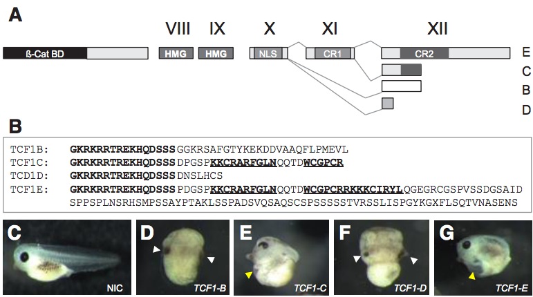 Fig. 1. Overexpression of single XTcf1 isoforms induces two distinct phenotypes dependent on the presence or absence of a (partial) C-clamp. (A) Schematic drawing of the genomic organisation of XTcf1 showing exons X to XII generating different XTcf-1 splice variants. The two conserved motifs CR1 and CR2 located on exons XI and XII comprise the C-clamp (Atcha et al., 2003). NLS: nuclear localization signal. HMG: high-mobility group DNA binding domain. (B) amino acid sequences of the different splice variants of XTcf1 downstream of exon X. (C-G) X. tropicalis embryos after lateral injection of the four different Tcf1 isoforms at the 2-cell stage. NIC, non-injected control; white arrow head, cement gland; yellow arrow head, heart.