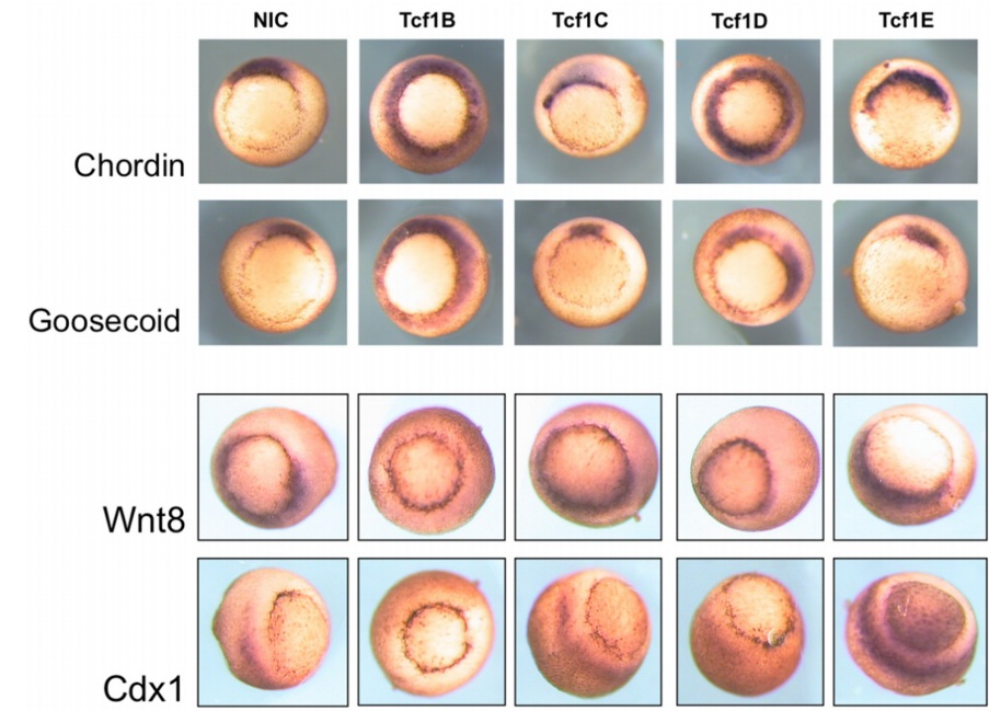 of gastrula stage embryos after injection of different XTcf1 isoforms. Overexpression of isoforms B and D induces ectopic dorsal mesoderm at the expense of ventrolateral tissue, as indicated by the expansion of