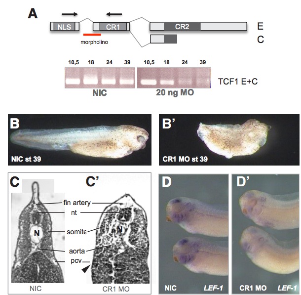 embryos injected with 20 ng splice MO using PCR primers amplifying exon X and XI. (B) Control stage 39 embryo. (Bâ) Phenotype of an embryo after injection of 20 ng splice MO. (C) Histological sections of stage 39 NICembryo showing clear vessels. (Câ) CR1 MO injected embryo showing lack of major blood vessels (cf Roël et al., 2009). Arrow indicates expected level of the posterior cardinal vein (pcv). (D) In situ hybridization of XLef1 in NIC stage 32 embryo and XTcf1- CR1 splice MO (10 ng) injected embryo (Dâ).XLef1 expression is downregulated in the branchial arches and the midbrain.