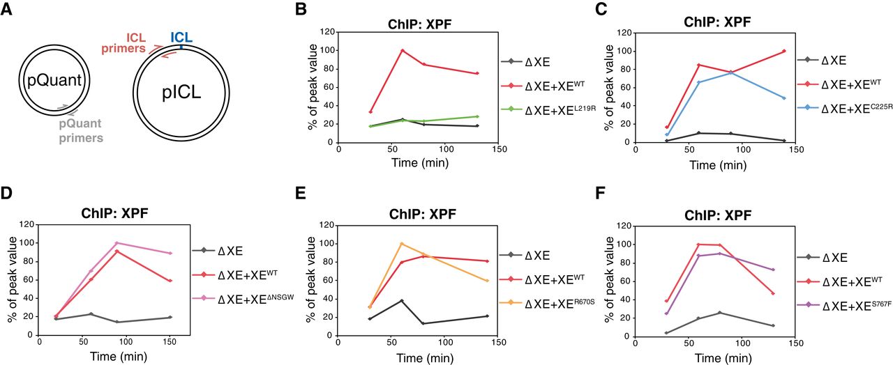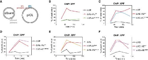 Figure 5. Recruitment of XPF‐ERCC1 mutants to the ICL during repair A. Schematic representation showing the primer locations on pICL and pQuant. B. pICL was replicated in XPF‐ERCC1‐depleted (ΔXE) or XPF‐ERCC1‐depleted egg extract supplemented with wild‐type (XEWT) or mutant XPF‐ERCC1 (XEMUT; see Appendix Fig S2). Samples were taken at various times and immunoprecipitated with α‐XPF antibodies. Co‐precipitated DNA was isolated and analyzed by quantitative PCR using the primers depicted in (A). The qPCR data were plotted as the percentage of peak value with the highest value within one experiment set to 100%. C–F As in (B) but using the indicated XPF‐ERCC1 mutant complexes. Experimental replicates are shown in Appendix Fig S2. |