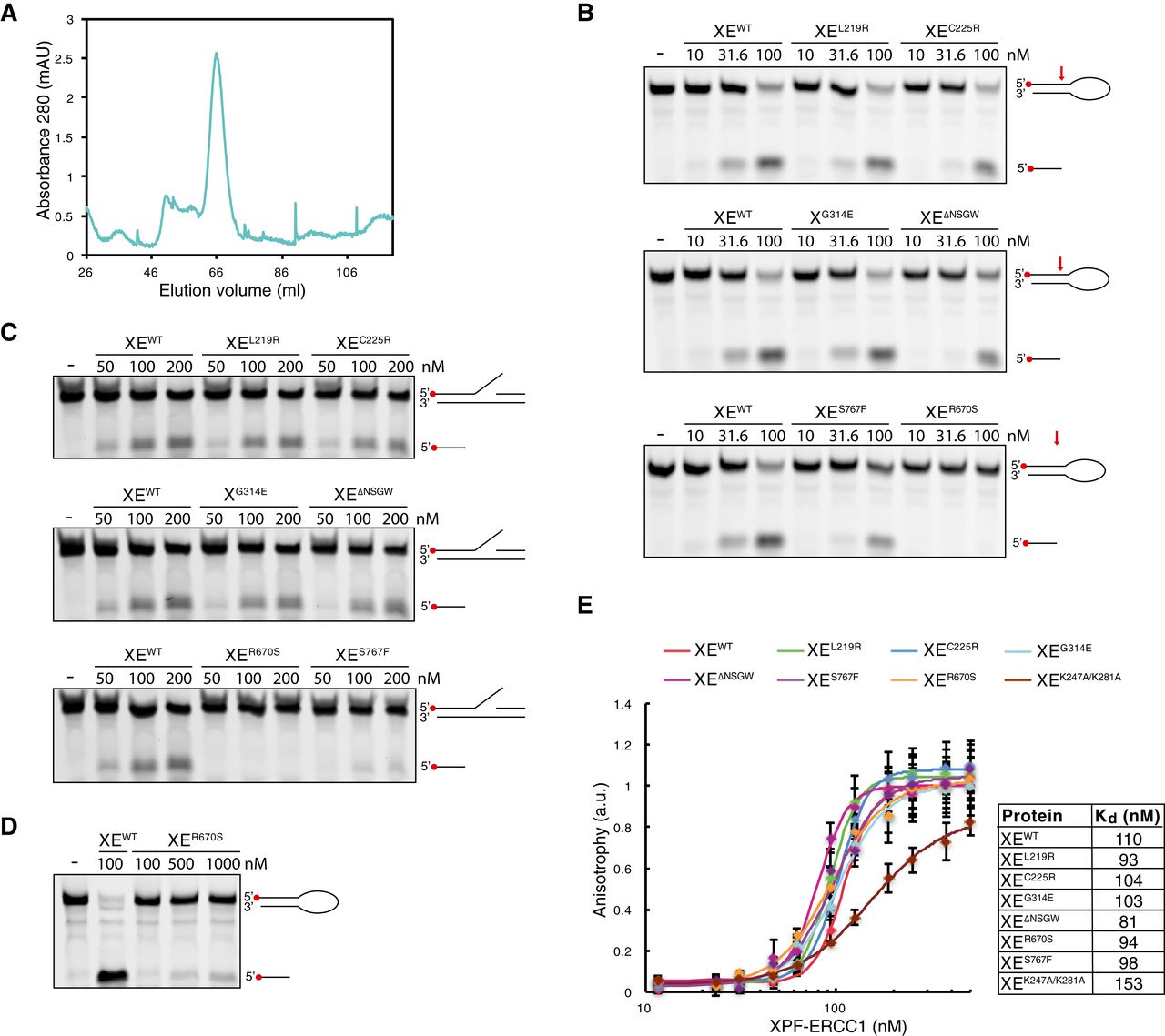 Fig. 1. Characterization of mutant XPFâERCC1 complexes. A. Schematic representation of the domain organization of the XPF protein. Domain boundaries of human and Xenopus laevis XPF are indicated. Relevant mutations of the human protein, and the Xenopus laevis equivalents, are indicated on top and bottom, respectively. B. Superdex 200 gel filtration column elution profile of wildâtype XPFâERCC1 and indicated mutant complexes. Aggregates eluted in the void volume of the column (Ë45 ml) while the active XPFâERCC1 heterodimer eluted at Ë65 ml. The peak eluting at Ë105 ml contains the FLAG peptide used to elute the protein from the FLAG affinity resin. The heterodimer peak was isolated, and proteins were separated on SDSâPAGE and stained with Coomassie blue (inset). C. As in (B) but for different mutant complexes that showed more aggregation. D. Wildâtype and indicated mutant XPFâERCC1 complexes were incubated with a 5â²âFAMâlabeled stemâloop DNA substrate (10 nM) at room temperature for 30 min. Reaction products were separated on a 12% ureaâPAGE gel and visualized using a fluorescence imaging system. Red arrow indicates position of incision by XPFâERCC1. E. Wildâtype and mutant XPFâERCC1 complexes at various concentrations were incubated with a 5â²âFAMâlabeled 3â² flap DNA substrate (10 nM) and fluorescent anisotropy was measured. Graphs were fitted to calculate dissociation constants (Kds) as described in the Materials and Methods section. The error bars represent s.d. from three measurements. Experimental replicates are shown in Fig EV2. Source data are available online for this figure. |