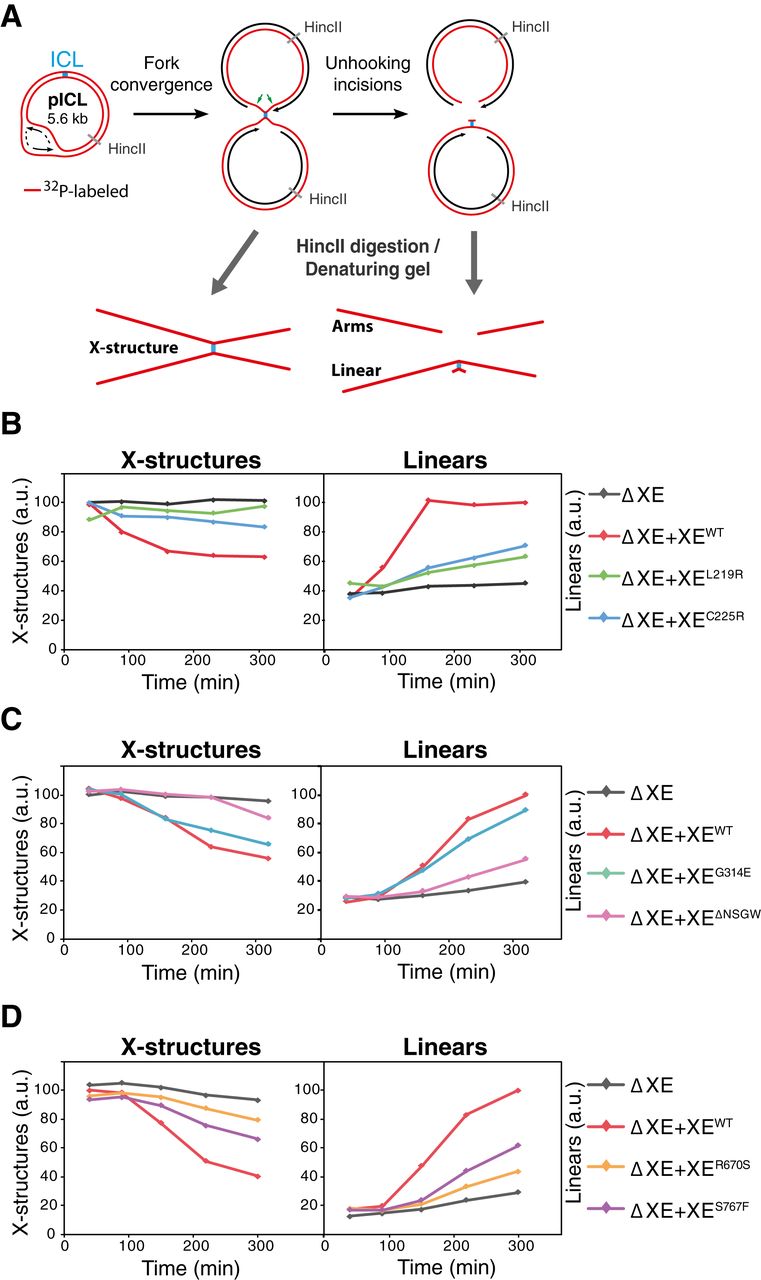 Figure 4. XPF‐ERCC1 separation‐of‐function mutants are all defective in ICL unhooking A. Schematic representation of the assay used to directly measure unhooking incisions. 32P‐labeled parental stands are indicated in red. Products before and after ICL unhooking during repair are indicated. HincII digestion of repair intermediates yields X‐structures, arms, and linears under denaturing conditions. B. XPF‐ERCC1‐depleted (ΔXE) or XPF‐ERCC1‐depleted egg extract complemented with wild‐type (XEWT) or mutant XPF‐ERCC1 (XEMUT) were incubated with pre‐labeled pICL. Repair products were isolated at indicated times, linearized with HincII, separated on a denaturing agarose gel, and visualized by autoradiography. The X‐structures and linear products were quantified and plotted. C, D As in (B) but using different XPF‐ERCC1 mutant complexes. Experimental replicates are shown in Appendix Fig S1. |