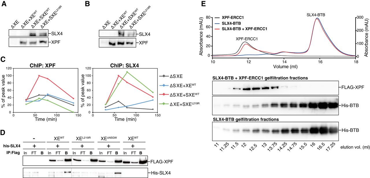 Figure EV5. XPF leucine 219 is part of the major interaction site between XPF and SLX4 XPF‐ERCC1‐depleted (ΔXE) and XPF‐ERCC1‐depleted NPE supplemented with XPF‐ERCC1 (+XEWT), XPF‐ERCC1 and SLX4 (+SXEWT), or XPFL219R‐ERCC1 and SLX4 (+SXEL219R) were analyzed by Western blot using α‐XPF and α‐SLX4 antibodies. Extracts were used for Fig 6A. As in (A). Replicate of Fig 6A. The extracts from (B), with similarly treated HSS, were used to replicate pICL. Samples were taken at the indicated times and analyzed by XPF (left) and SLX4 (right) ChIP using pICL and pQuant primers. The qPCR data were plotted as the percentage of peak value with the highest value set to 100%. Replicate of Fig 6C. Wild‐type and mutant FLAG‐XPF‐ERCC1 were co‐expressed with His‐SLX4 in Sf9 insect cells. Cells were lysed and XPF was immunoprecipitated via the FLAG‐tag. Samples were analyzed by Western blot using α‐FLAG and α‐His antibodies. In, input; FT, flow‐through fraction; B, fraction bound to beads. Size exclusion chromatography of recombinant XPF‐ERCC1 and BTB domain of SLX4. Superdex 200 gel filtration column elution profile of FLAG‐XPF‐ERCC1, His‐tagged BTB domain, and both proteins combined (top panel). The XPF‐ERCC1 heterodimer eluted at ˜12 ml, while His‐BTB eluted around ˜16 ml. Collected fractions during elution were analyzed by Western blot using α‐XPF and α‐His antibodies (bottom panel). The BTB domain protein does not shift to a higher elution volume when incubated with XPF‐ERCC1 indicating the affinity is not high enough to show binding between the two proteins. Source data are available online for this figure. |