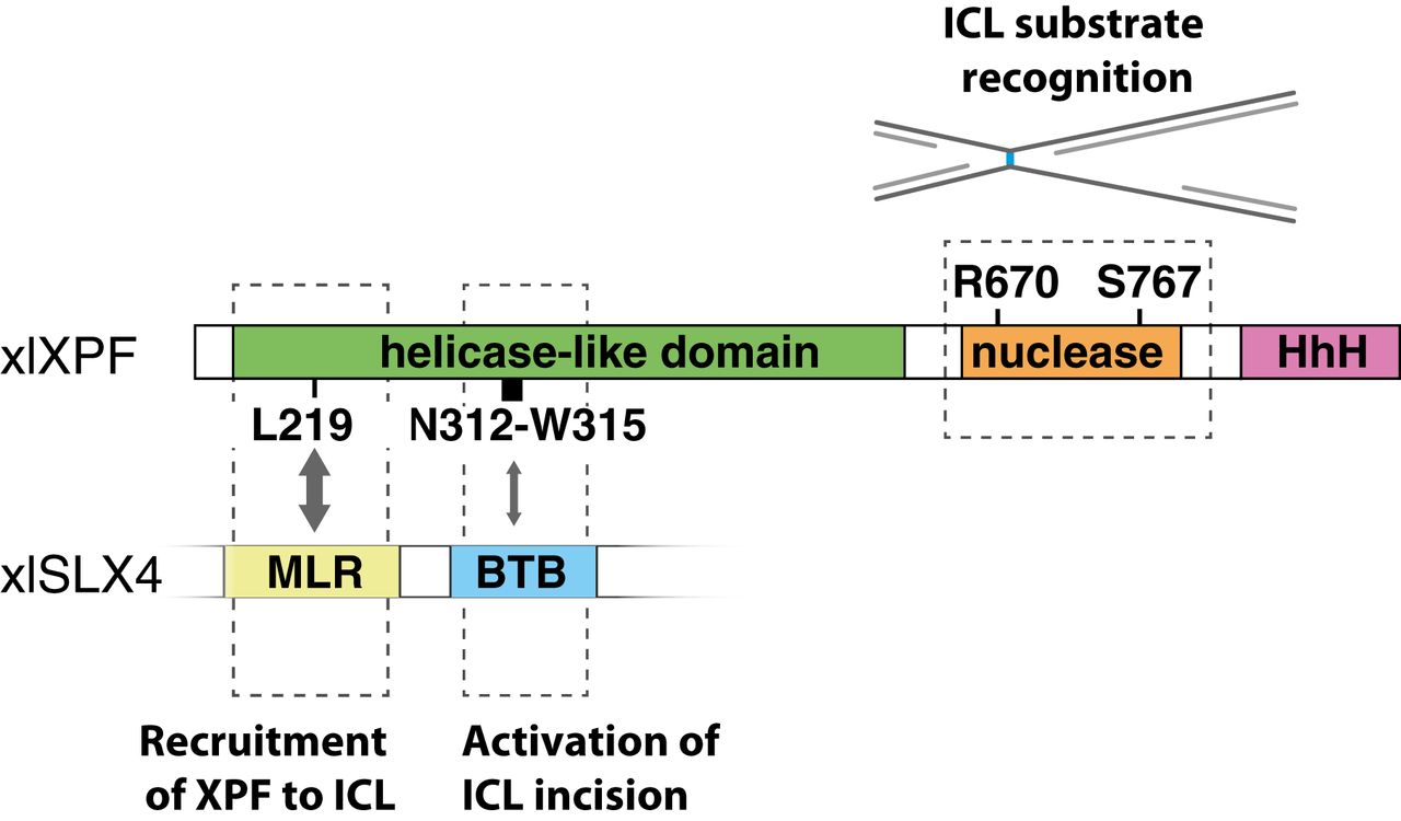 Figure 7. Model for ICL repair‐specific features of XPF Leucine 219 in the helicase‐like domain of XPF is essential for the interaction of XPF with the MLR domain of SLX4. This interaction mediates the recruitment of XPF to an ICL. Residues 312–315 transiently interact with the BTB domain of SLX4 and are required for the incisions of an ICL by XPF. Arginine 670 and serine 767 in the nuclease domain of XPF are crucial for the recognition of the ICL substrate. |