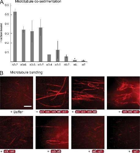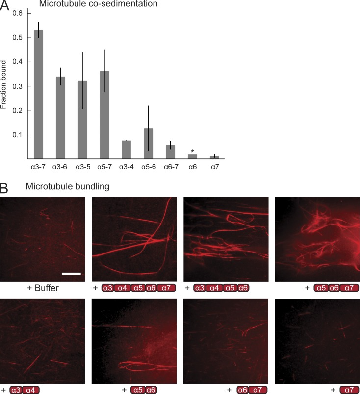 Figure 2. Multiple domains of TPX2 contribute to its ability to bind and bundle MTs in vitro. (A) Co-sedimentation assay of 1 µM of various TPX2 constructs with Taxol-stabilized MTs in vitro. The ratio of protein in the supernatant and pellet after centrifugation was used to calculate the fraction of total protein bound to MTs. Values are the mean of two experiments, and error bars represent standard deviation. *, TPX2 α6 was only tested once. (B) MT bundling assay using Alexa Fluor 568–labeled GMPCPP-stabilized MTs in vitro with 1 µM of various TPX2 constructs. Bar, 10 µm. Assay was repeated three times.