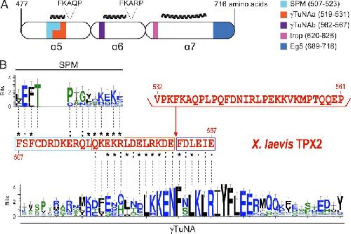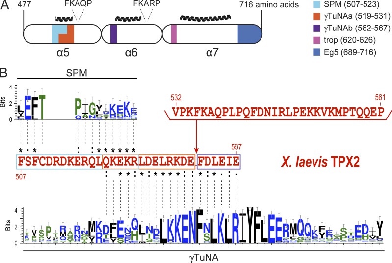 Figure 3. Identification of novel motifs within TPX2 α5–α7. (A) Domain organization of TPX2 α5–α7 showing newly found motifs. Amino acids 507–523 (cyan) share homology with the SPM, and amino acids 519–531 (orange) and 562–567 (purple) share homology with the γTuNA motif, both of which have a γ-TuRC activation function in the proteins where they were originally identified. Amino acids 620–626 (pink) have been suggested to negatively regulate MT nucleation in Xenopus egg extract, and their absence in X. tropicalis TPX2 leads to increased MT formation. Amino acids 689–716 (blue) are necessary for the interaction between TPX2 and the kinesin Eg5. (B) Graphical representation of the SPM of pericentrin/Spc110 across multiple species and the γTuNA motif of Mto1/centrosomin/CDK5RAP2 and the related myomegalin across multiple species. The motif sequence logos were made using WebLogo 3. Sequence alignment reveals homology between these motifs and sequences within TPX2 α5–α7 (red sequence), revealing the new motifs SPM (cyan box), γTuNAa (orange box), and γTuNAb (purple box). γTuNAa and γTuNAb are separated by a stretch of 29 amino acids.