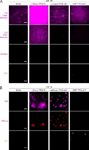 Figure 6. TPX2 α5–α7 does not induce MT assembly in vitro. (A) Representative images of MTs formed after incubation of 200 nM fluorescent full-length TPX2, TPX2 α3–α7, and TPX2 α5–α7 with 30 µM tubulin. (B) Same as A, but using 800 nM of each TPX2 construct. At this concentration, full-length TPX2 and TPX2 α3–α7 also form tubulin aggregates. Assay was repeated two times. Bars, 10 µm.