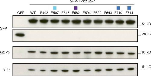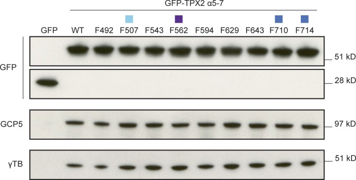 Figure 7. Single-site mutations within TPX2 α5–α7 do not interfere with the interaction of γ-TuRC. Immunoprecipitation of 1 µM GFP-tagged TPX2 constructs from Xenopus egg extracts using an antibody specific against GFP. The same GFP antibody was used for detection in the immunoblot, along with commercial antibodies against GCP5 and γ-tubulin. Assay was repeated three times. WT, wild type.