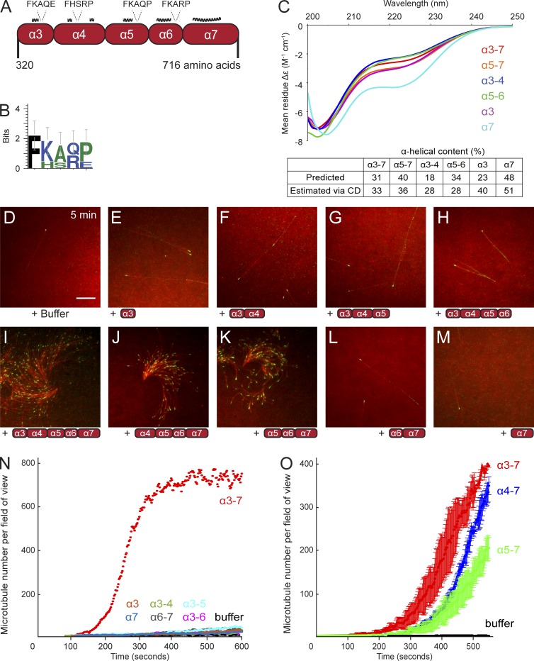 Figure 1. TPX2 α5–α7 is the minimal construct that stimulates branching MT nucleation. (A) Domain organization of the C-terminal half of X. laevis TPX2 based on secondary structure prediction using Jpred. (B) Graphical representation of the FKARP motif, which occurs after predicted α-helices in domains α3 through α6. (C) CD spectra of various TPX2 constructs in the region of 200–250 nm. All spectra suggest the presence of significant α-helical content, which is characterized by two minima near 208 nm and 220 nm. Estimates of secondary structure content using the K2D3 method agree with values obtained from the Jpred prediction. (D–M) Branching MT nucleation in Xenopus egg extracts in the presence of 2 µM of different truncated TPX2 constructs. The same results were obtained with a lower TPX2 concentration of 0.75 µM. EB1-GFP (green) and Alexa Fluor 568–labeled porcine brain tubulin (red) were added to the extract to follow MT plus ends and MTs, respectively. Vanadate was added to prevent dynein-mediated gliding of MTs. All images were taken after 5 min. Brightness and contrast were adjusted for each image individually to optimize visual comparison of MT structures. Bar, 10 µm. See Video 1. (N) The number of individual MTs was counted for each time frame and then plotted against time. The data are displayed for addition of TPX2 α3–α7 and all the inactive constructs. (O) Same as N, except the number of MTs is averaged over two experimental replicates for the addition of TPX2 α3–α7 and the other active constructs α4–α7 and α5–α7. Error bars represent absolute error. All extract experiments were performed at least three different times.