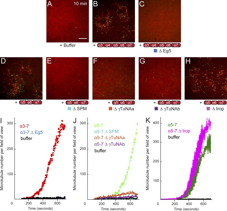 Figure 4. The newly identified motifs in TPX2 are necessary to stimulate branching MT nucleation. (A–H) Branching MT nucleation in Xenopus egg extracts and in the presence of 2 µM TPX2 α3–α7 or α5–α7, with and without various motif deletions. The same results were obtained with a lower TPX2 concentration of 0.75 µM. EB1-GFP (green) and Alexa Fluor 568–labeled porcine brain tubulin (red) were added to follow MT plus ends and MTs, respectively. Vanadate was added to prevent dynein-mediated gliding of MTs. All images were taken after 10 min. Brightness and contrast were adjusted for each image individually to optimize visual comparison of MT structures. Bar, 10 µm. See Video 2. (I and J) For each reaction, the number of individual MTs was counted for each time frame and then plotted against time. The data are displayed for TPX2 α3–α7 and TPX2 α5–α7 and their inactive deletion mutants. (K) Same as I and J, but here the number of MTs is averaged over two experimental replicates for TPX2 α5–α7 and the only active deletion mutant, TPX2 α5–α7 Δtrop. Error bars represent absolute error. All extract experiments were performed at least three different times.