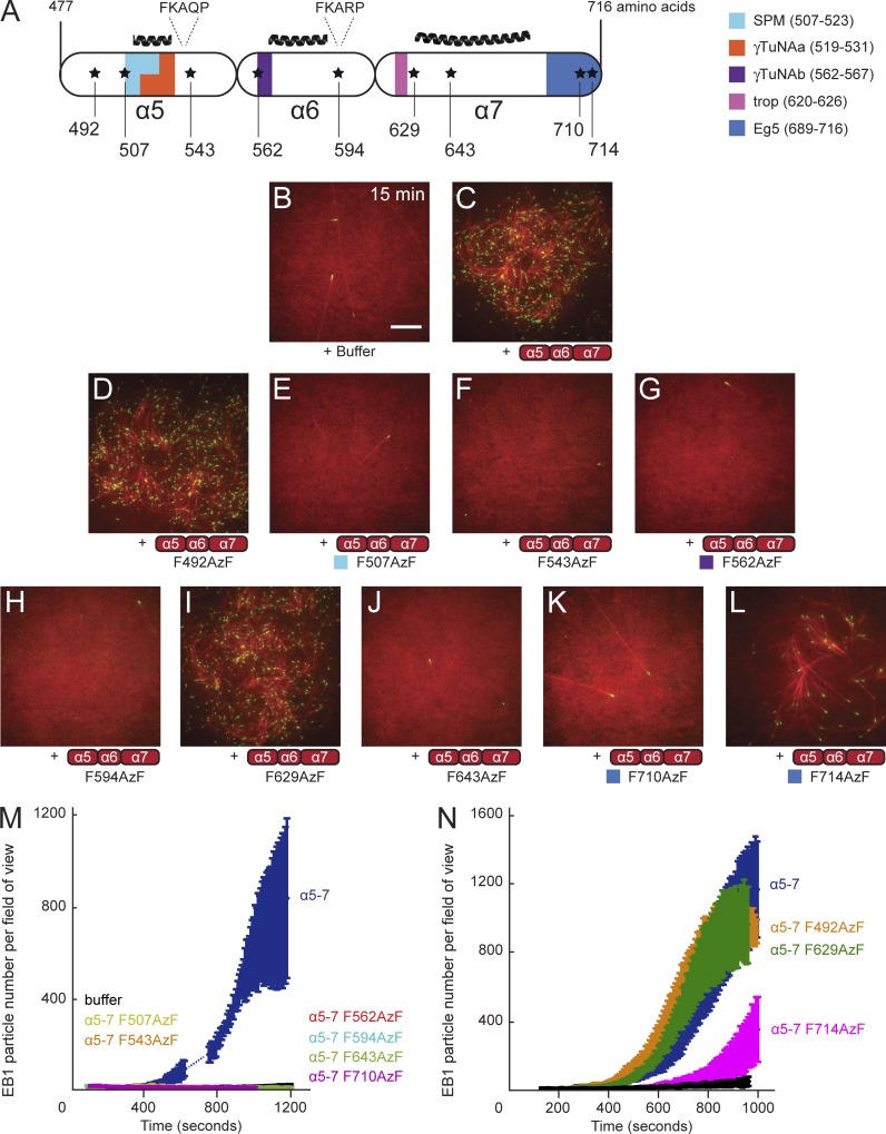 Figure 5. Branching MT nucleation activity of multiple TPX2 single-site mutants. (A) Domain organization of TPX2 α5–α7 showing the location of single-site mutations. (B–L) Branching MT nucleation in Xenopus egg meiotic extracts and in the presence of 2 µM TPX2 α5–α7 with and without various single-site mutations. The same results were obtained with a lower TPX2 concentration of 1 µM. Images for F492AzF, F629AzF, and F714AzF mutants, which show a high level of activity, as well as the image for the positive control TPX2 α5–α7, were collected using one extract. Images for the rest of the mutants and the negative control were collected with a different extract. This was necessary because the lifetime of one extract was incompatible with the high number of samples; however, both controls are representative and consistent among all extracts tested. EB1-mCherry (green) and Cy5-labeled porcine brain tubulin (red) were added to the extract to follow MT plus ends and MTs, respectively. Vanadate was added to prevent dynein-mediated MT gliding. All images were acquired after 15 min. Brightness and contrast were adjusted for each image individually to optimize visual comparison of MT structures. Bar, 10 µm. See Video 3. (M) The number of EB1 particles was counted for three different fields of view and the mean was plotted against time. The data are displayed for the addition of TPX2 α5–α7 and all the inactive mutants. Data collection for the positive control, TPX2 α5–α7, was interrupted in the region denoted by the dashed line. Error bars represent standard deviation. (N) Same as M, but the data are depicted for the addition of TPX2 α5–α7 and mutants that have full or intermediate activity. Measurements also represent the mean of three different fields of view, and the error bars denote standard deviation. All extract experiments were performed at least three different times.