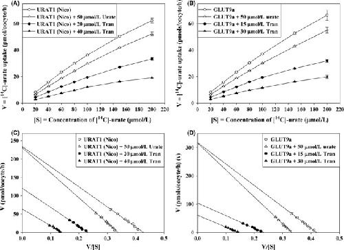 Uric acid, generated from the metabolism of purines, has both proven and emerging roles in human disease. Serum uric acid in humans is determined by production and by the net balance of reabsorption and secretion in kidney and intestine. In the human kidney, epithelial reabsorption dominates over secretion, such that in normal subjects there is at least 90% net reabsorption of filtered urate resulting in a fractional excretion of <10%. Tranilast, an anti-inflammatory drug with pleiotropic effects, has a marked hypouricemic, uricosuric effect in humans. We report here that tranilast is a potent inhibitor of [14C]-urate transport mediated by the major reabsorptive urate transporters (URAT1, GLUT9, OAT4, and OAT10) in Xenopus oocytes; this provides an unequivocal molecular mechanism for the drug's uricosuric effect. Tranilast was found to inhibit urate transport mediated by URAT1 and GLUT9 in a fully reversible and noncompetitive (mixed) manner. In addition, tranilast inhibits the secretory urate transporters NPT1, OAT1, and OAT3 without affecting the secretory efflux pump ABCG2. Notably, while benzbromarone and probenecid inhibited urate as well as nicotinate transport, tranilast inhibited the urate transport function of URAT1, GLUT9, OAT4, OAT10, and NPT1, without significantly affecting nicotinate transport mediated by SMCT1 (IC 50 ~1.1 mmol/L), SMCT2 (IC 50 ~1.0 mmol/L), and URAT1 (IC 50 ~178 μmol/L). In summary, tranilast causes uricosuria by inhibiting all the major reabsorptive urate transporters, selectively affecting urate over nicotinate transport. These data have implications for the treatment of hyperuricemia and gout, the pharmacology of tranilast, and the structure-function analysis of urate transport.