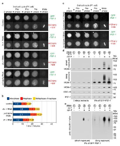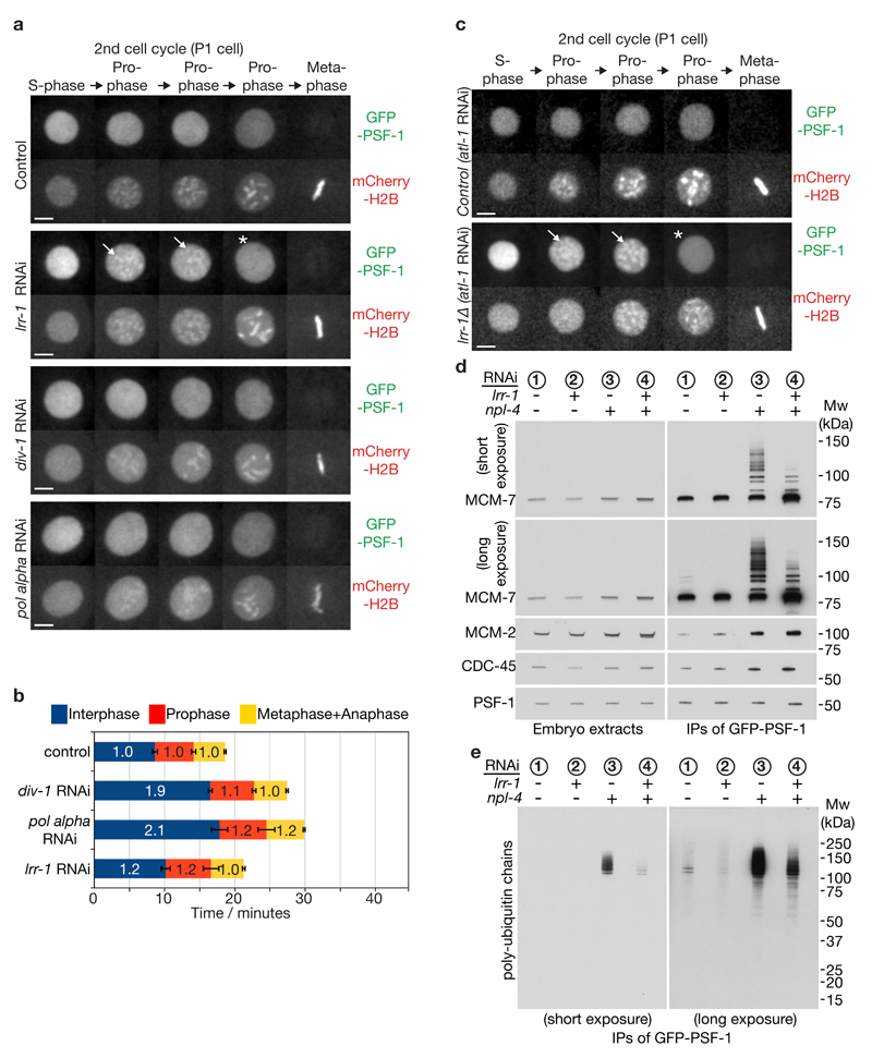 Figure 3. A mitotic pathway for CMG helicase disassembly is revealed in the absence of CUL-2LRR-1.(a) Embryos from GFP-psf-1 mCherry-H2B worms were exposed to the indicated RNAi treatments, or empty vector in the control, and then processed as in Figure 1b, except that the figure depicts data from the second embryonic cell cycle (P1 cell). Timelapse images are shown from S-phase to metaphase. GFP-PSF1 initially persists on prophase chromatin following depletion of LRR-1 (the arrows denote examples), before being released in late prophase (indicated by asterisk). Scale bars correspond to 5µm. (b) The duration of the indicated cell cycle phases for the experiment in (a) were measured as described in Methods. The data are expressed relative to the length of the corresponding period in control embryos, and represent the mean values (n = 5 embryos; the lines on the boundary of each cell cycle phase indicate standard deviations from the mean). (c) Worms homozygous for GFP-psf-1 and lrr-1Δ were grown in parallel to the equivalent heterozygote (control), as described in Methods. After exposure to atl-1 RNAi (this allows homozygous lrr-1Δ germ cells to proceed with meiosis), the resultant embryos were processed as above. The images depict the second embryonic cell cycle (P1 cell), showing persistent association of GFP-PSF-1 with chromatin during prophase (arrows), before release in late prophase (asterisk). (d-e) Homozygous GFP-psf-1 worms were exposed to the indicated RNAi. Embryos were then isolated and processed as in Figure 1e-f. Unprocessed scans of key immunoblots are shown in Supplementary Figure 8. |