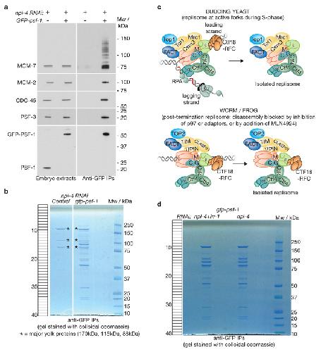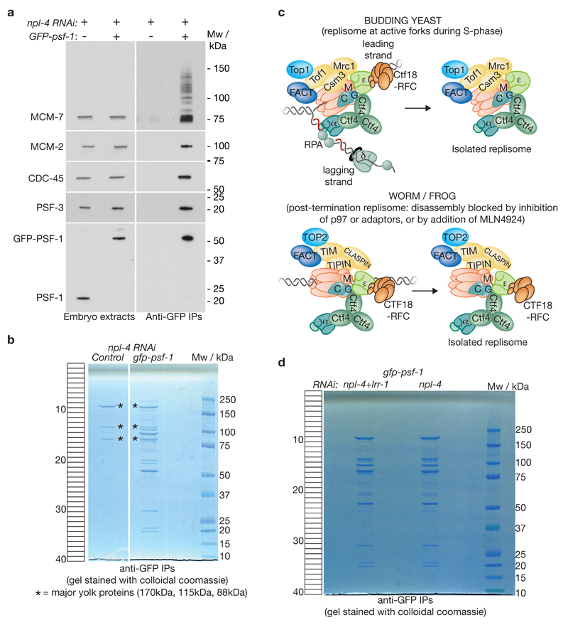 Figure 5. Isolation of the post-termination worm replisome.(a) Control or homozygous GFP-psf-1 worms were exposed to npl-4 RNAi before being processed as described above for Figure 4. The purified samples were monitored by SDS-PAGE and immunoblotting of the indicated components of the CMG helicase. (b) The remainder of the samples were then resolved in a 4-12% gradient gel, which was stained with colloidal coomassie. The major contaminants in both samples (marked with asterisks) represent the four major yolk proteins of the worm early embryo40. Each lane was cut into 40 bands as indicated, before analysis of protein content by mass spectrometry (see Supplementary Table 2). (c) Comparison of the replisome isolated from active replication forks in budding yeast 1, 41, 42, with the isolated post-termination replisome from worm and frog (this study). For simplicity, some of the proteins that act at forks, but that are not present in the isolated replisome, have been omitted. In addition, Mcm10 has been excluded, since its status at forks and its association with the isolated replisome remain unclear (absent from isolated yeast and worm replisomes under physiological conditions, but co-purifying with frog MCM-3 from digested chromatin post-termination). (d) Comparison of isolated replisome material for the experiment in Supplementary Table 3 (worms treated with npl-4 RNAi or npl-4 lrr-1 double RNAi). Unprocessed scans of key immunoblots are shown in Supplementary Figure 8. |