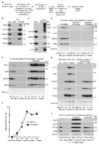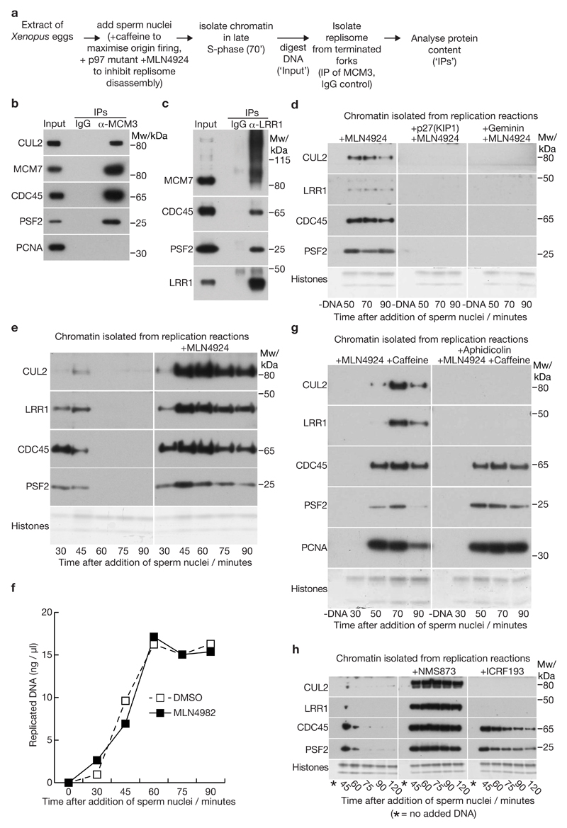 Figure 6. CUL2LRR1 associates with the post-termination vertebrate replisome and is recruited to chromatin during DNA replication termination in Xenopus egg extracts.(a) Experimental scheme for isolation of proteins associated with the CMG helicase after termination in the absence of replisome disassembly, in extracts of Xenopus laevis eggs. (b) Immunoblots of input and the indicated IP samples for the experiment in (a). (c) Replisome disassembly was inhibited with the p97 inhibitor NMS873, and LRR1 was then isolated from digested chromatin at the 70â timepoint, in parallel with a control IP with IgG, before detection of the indicated proteins by immunoblotting. (d) Chromatin association of the indicated factors was monitored by immunoblotting, at the indicated timepoints after addition of sperm chromatin to egg extracts (except for the -DNA sample that lacked chromatin). Where indicated, replication initiation was blocked by addition of p27(KIP1) or Geminin. The neddylase inhibitor MLN4924 was added to all samples to block replisome disassembly. (e) Timecourse experiment comparing chromatin-bound factors in the absence or presence of the neddylation inhibitor MLN4924. (f) Replication kinetics were monitored for the experiment in (e), by incorporation of radiolabelled α-dATP into newly synthesised DNA (see also Supplementary Figure 5b; source data for repeats of this experiment are included in Supplementary Table 6). (g) Inhibition of DNA synthesis blocks association of CUL2LRR1 with chromatin. DNA synthesis was inhibited with the DNA polymerase inhibitor aphidicolin. Caffeine was added to inactivate the S-phase checkpoint, which otherwise would have reduced the level of CMG on chromatin +Aphidicolin. (h) Analogous experiment to that in (e), showing that CUL2-LRR1 accumulated on chromatin with CMG when replisome disassembly was blocked by the p97 inhibitor NMS873, but chromatin recruitment of CUL2-LRR1 was inhibited if DNA replication termination was delayed by addition of the TOPO2 inhibitor ICRF193. Unprocessed scans of key immunoblots are shown in Supplementary Figure 8. |