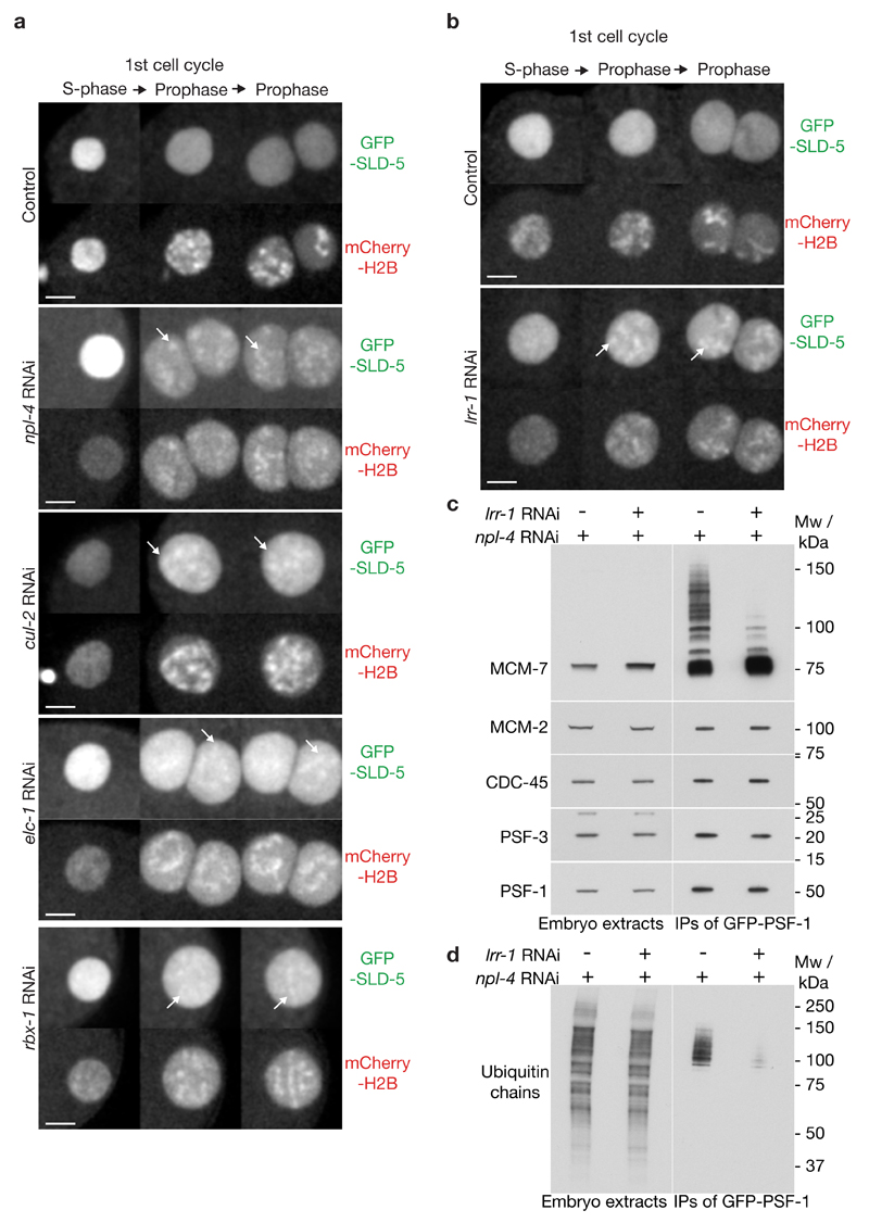 Figure 2. CUL-2LRR-1 is required for CMG helicase disassembly during S-phase in C. elegans.(a-b) Embryos from GFP-sld-5 mCherry-H2B worms were exposed to the indicated RNAi and processed as in Figure 1b. Timelapse images are shown from S-phase to mid-prophase. Five embryos were examined for each treatment and all behaved equivalently. Arrows denote examples of persistence of GFP-SLD-5 on prophase chromatin and scale bars correspond to 5µm. (c-d) Embryos from homozygous GFP-psf-1 / GFP-psf-1 worms were exposed to the indicated RNAi and processed as in Figure 1e-f. Unprocessed scans of key immunoblots are shown in Supplementary Figure 8. |