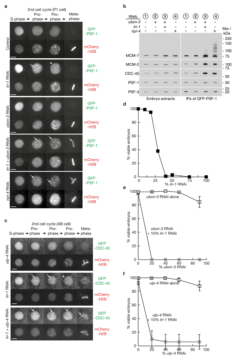 Figure 4. The mitotic CMG helicase disassembly pathway requires UBXN-3 and is modulated by the SUMO protease ULP-4, both of which become essential when LRR-1 is depleted.(a) Embryos from GFP-psf-1 mCherry-H2B worms were exposed to the indicated RNAi and processed as in Figure 3a. The arrows indicate persistent association of GFP-PSF1 with mitotic chromatin (throughout mitosis in the case of RNAi to npl-4, or after simultaneous RNAi to lrr-1 + ubxn-3), whereas the asterisk denotes release of GFP-PSF-1 from chromatin in late prophase in embryos treated only with lrr-1 RNAi. The scale bars correspond to 5µm. (b) Homozygous GFP-psf-1 worms were exposed to the indicated RNAi and isolated embryos were then processed as in Figure 1e. (c) Embryos from GFP-cdc-45 mCherry-H2B worms were exposed to the indicated RNAi and processed as above. The data correspond to the AB cell in the second cell cycle, in which lrr-1 ulp-4 double RNAi leads to persistence of GFP-CDC-45 until at or after nuclear envelope breakdown (8 of 9 embryos tested). (d) Worms were fed on plates where the indicated proportion of bacteria expressed lrr-1 double-stranded RNAi, and embryonic viability was measured as described in Methods (for each timepoint, 69-94 embryos were examined from five adult worms). (e) Worms were fed on the indicated proportion of bacteria expressing ubxn-3 RNAi, either alone or in combination with 10% bacteria expressing lrr-1 RNAi. The data represent the mean values (n = 3 independent experiments; for each timepoint, 70-100 embryos were examined from five adult worms), with the indicated standard deviations from the mean value. (f) Similar experiment involving increasing doses of ulp-4 RNAi, with or without 10% lrr-1 RNAi (n = 3 independent experiments; for each timepoint, 70-100 embryos were examined from five adult worms). Unprocessed scans of key immunoblots are shown in Supplementary Figure 8. |