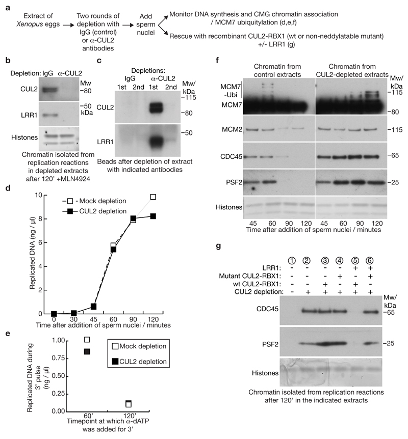 Figure 7. Active CUL2LRR1 is required for extraction of CMG components from chromatin during DNA replication termination in Xenopus egg extracts.(a) Experimental scheme. (b) Replication reactions were performed in the presence of MLN4924 to stabilise CUL2LRR1 on chromatin during DNA replication termination in mock-depleted extracts (treated with two rounds of IgG-beads). In contrast, neither CUL2 nor LRR1 were detected on chromatin in CUL2-depleted extracts, confirming the efficiency of the depletion. (c) Depletion of CUL2 also removes LRR1 from the extract (the panel shows immunoblots of the antibody-coupled beads after each of the two rounds of depletion). (d) Kinetics of DNA synthesis in extracts subjected to two rounds of immunoprecipitation with control IgG (‘mock depletion’) or with antibodies to Hs_CUL2-RBX1 (‘CUL2 depletion’, see Methods). Source data for repeats of this experiment are included in Supplementary Table 6. (e) In an analogous experiment, replication reactions were performed in ‘mock-depleted’ and CUL-depleted extracts. A pulse of α-dATP was added for 3’ at either the 60’ or 120’ timepoints, and the incorporation of radiolabel into nascent DNA was monitored after isolation of total DNA, indicating that replication proceeded and completed with similar kinetics in both extracts, consistent with the data in (d). (f) Kinetics of chromatin association of the indicated factors for the same experiment shown in (a-b). Note that the MCM7 immunoblot is over-exposed in order to reveal the ubiquitylated forms of the protein. (g) Mock-depleted or CUL2-depleted extracts were supplemented with the indicated recombinant proteins (X.l. LRR1, wt/mutant Hs_CUL2-RBX1 – see Methods), and chromatin was isolated from the 120’ timepoint in a similar experiment to that described above. Unprocessed scans of key immunoblots are shown in Supplementary Figure 8. |