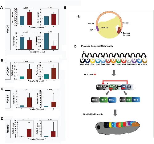 (A) Q-PCR for HoxD1 at st.10.5, 11, 12 and 15 in WT and HoxB4 GR (activated at st.8) injected embryos. (B) Q-PCR for HoxB4 at st.10.5 and 11 in WT and HoxB4 injected embryos. (C) Q-PCR for HoxB6 at st.11 and 11.5 in WT and HoxB4 injected embryos. (D) Q-PCR for HoxB9 at st.11.5 and 12 in WT and HoxB4 injected embryos. (E) The known facts concerning auto-regulation, posterior induction and posterior prevalence in A-P Patterning. (a) Hox genes start to be expressed from early gastrulation onward in the non-organiser mesoderm (NOM), where there are high levels of BMP. At this stage, their nested expression domains overlap fully with each other. (b) During gastrulation and early neurulation, auto-regulation (A) and posterior induction (PI) together enable Hox genes (coloured discs) to be expressed in a temporal order that matches their 3' to 5' order on the chromosome (temporal collinearity) The sequential times of initial expression of the neighbouring Hox genes are indicated by the small clock faces. Since the precise control of Hox activation time is vital to function, posterior induction (black arrows) may possibly occur in a cascade manner to ensure the expression of Hox genes in the correct order. Data is not presently available to determine whether this is the case. Starting from neurulation, posterior prevalence (PP) exerts its influence in neurectoderm and paraxial mesoderm, where there are relatively low levels of BMP. The coordination between auto-regulation, posterior induction and posterior prevalence during this stage helps to establish a pre-pattern, resulting in non-overlapping or partially overlapping expression. Notably, posterior prevalence does not happen in a cascade manner since it is not required for driving the Hox timer. Later during axis elongation, these earlier events lead to a spatial pattern being established (spatial collinearity).