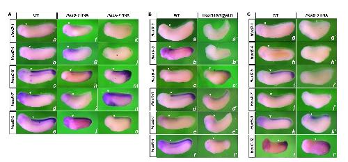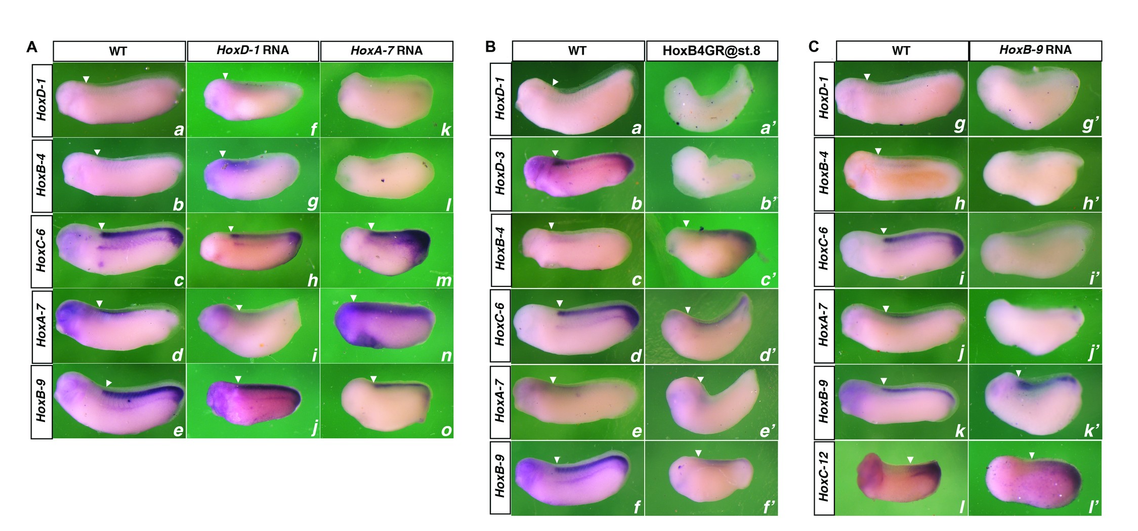 (A) The expression of HoxD-1, HoxB-4, HoxC-6, HoxA-7 and HoxB-9 is shown for WT (a-e), HoxD-1 injected (f-j) and HoxA-7 injected (k-o) embryos. White arrows point to the anterior borders of gene expression. In HoxD-1 injected embryos, all the genes examined were anteriorised (f: n = 8/12; g: n = 10/13; h: n = 9/16; i: n = 9/13; j: n = 10/15). In HoxA-7 injected embryos, HoxD-1 (k, n = 5/10), HoxB-4 (l, n = 6/14) were repressed, HoxC-6 (m, n = 15/15) was not affected, and HoxA-7 (n, n = 11/14) and HoxB-9 (o, n = 14/16) were anteriorised. (B) The expression of HoxD-1, HoxD-3, HoxB-4, HoxC-6, HoxA-7 and HoxB-9 is shown for WT (a-f) and HoxB-4 GR (activated at st.8) injected (aâ-fâ) embryos. White arrows point to the anterior borders of gene expression. In HoxB-4 injected embryos, the expression of HoxD-1 (aâ, n = 9/17) and HoxD-3 (bâ, n = 9/14) were repressed, whereas the expression of HoxB-4 (c', n = 9/15), HoxC-6 (d', n = 10/18), HoxA-7 (e', n = 8/13) and HoxB-9 (f', n = 18/25) were anteriorised. (C) The expression of HoxD-1, HoxB-4, HoxC-6, HoxA-7, HoxB-9 and HoxC-12 is shown for WT (g-l) and HoxB-9 injected (gâ-lâ) embryos. In HoxB-9 injected embryos, the expression of HoxD-1 (gâ, n = 4/9), HoxB-4 (hâ, n = 11/12), HoxC-6 (Iâ, n = 14/14) and HoxA-7 (jâ, n = 6/14) were repressed, whereas the expression of HoxB-9 (kâ, n = 12/12) and HoxC-12 (Iâ, n = 9/10) were anteriorised.