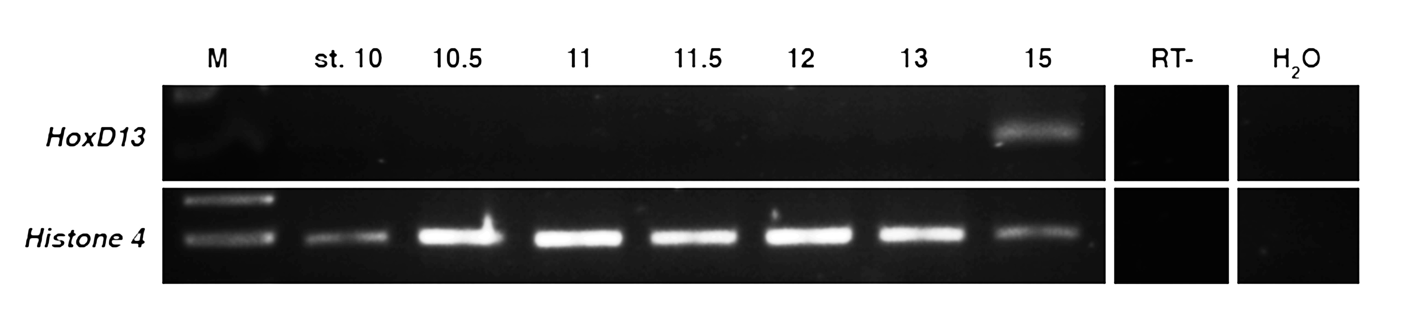 The expression of HoxD-13 was examined at st.10, 10.5, 11, 11.5, 12, 13 and 15. It started to be expressed at st.15.