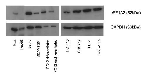 Figure 1. Western blot analysis using an anti-eEF1A2 antibody on a range of cell lines. The loading control is GAPDH.