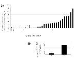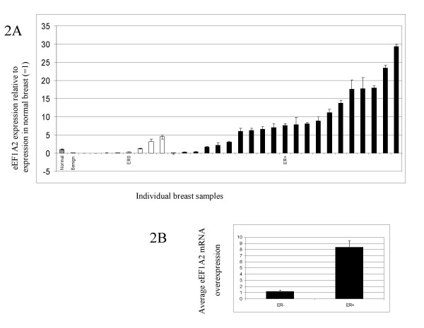 Figure 2. (A) Real-time RT-PCR analysis of RNA from breast tumours. Each block on the à axis represents a different tumour. The amount of eEF1A2 message is shown normalised to GAPDH and expressed relative to the level of expression in the normal breast RNA samples (=1). ER-negative tumours are shown in white, ER-positive tumours are shown in black. The difference in mean expression between ER-positive and ER-negative samples is 7.2 units (p = 0.0087), 95% Confidence Interval 2.0 to 12.4 units. (B) Average standardised RNA levels in ER-negative and ER-positive breast tumours. This difference is significant (P = 0.0087, t-test).