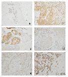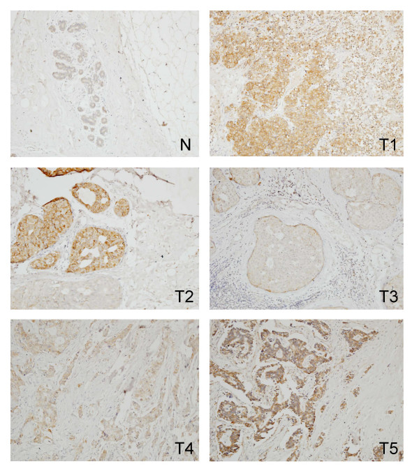 Figure 3. Immunohistochemistry of eEF1A2 in the breast. The panel labelled N shows the antibody staining weakly in a normal breast section. Panels T1 to T5 show breast tumours staining strongly with the anti-eEF1A2 antibody. Magnification ×10.