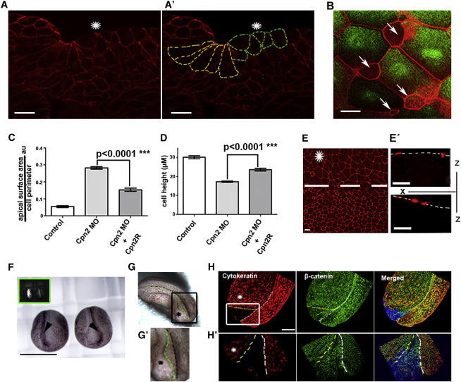 (A) Cross-section of a neurula-stage embryo injected at one dorsal blastomere at the four-cell stage with 40 ng CAPN2MO and stained with β-catenin. Injected side is indicated by an asterisk. β-catenin staining was used to trace the cortices of superficial cells (Aʹ). Scale bar, 20 μm.