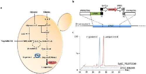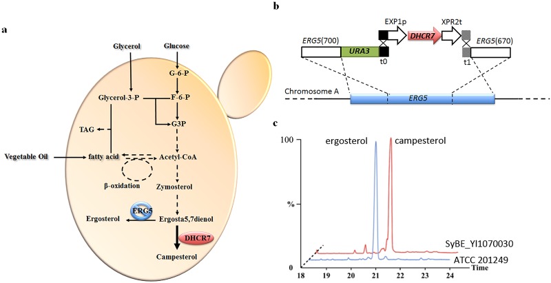 Fig 1. Overview of campesterol biosynthesis pathway and the corresponding genetic modification in Y. lipolytica.(a) Overview of campesterol biosynthesis pathway in Y. lipolytica. Campesterol was produced via expression of DHCR7 and disruption of ERG5 based on the ergosterol synthesis pathway in Y. lipolytica. Acetyl-CoA, the precursor of campesterol, is provided either by glycolysis from hydrophilic carbon sources (i.e. glucose and glycerol), or by β-oxidization from hydrophobic materials (e.g. oil). Meanwhile, acetyl-CoA from either hydrophilic or hydrophobic substrates can also generate cellular fatty acids and subsequently triacylglycerols (TAG), consisting of the de novo and the ex novo lipid accumulation process in Y. lipolytica respectively. (b) The method for expression of DHCR7 and disruption of ERG5 at the same time. The middle section of gene ERG5 was replaced by the DHCR7 expression cassette (URA3-EXP1p-DHCR7-XPR2t) in chromosome A. (c) GC-TOF/MS profile of the wild-type Y. lipolytica. ATCC 201249 and campesterol producing strain SyBE_Yl1070030. Wild-type strain (blue) showed an ergosterol peak at 21 min, while Y. lipolytica SyBE_Yl1070028 (red) showed a campesterol peak at 21.7 min.