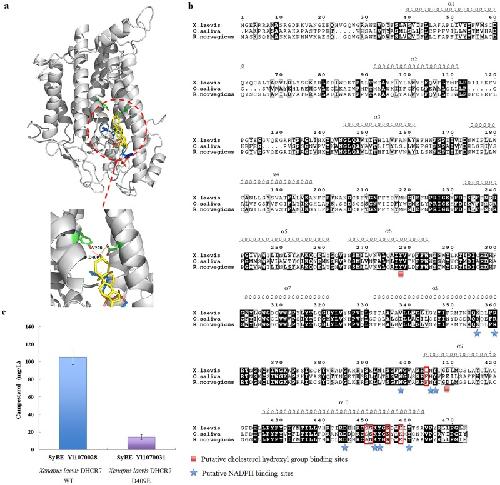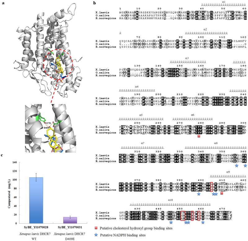 Fig 3. Sequences and architecture differences among DHCR7 from X. laevis, O. saliva and R. norvegicus.(a) Overview the structure model of DHCR7 from X. laevis. NADPH (blue) was docked into the NADPH pocket and ergosta-5,7-dienol (yellow) modelled into the substrate binding pocket in the DHCR7 structure. The pocket for substrate binding was enlarged and present below, indicating that Y278 and D409 clamp the hydroxyl of the substrate through a hydrogen-bonding network. (b) Sequences alignment of DHCR7 from X. laevis, O. saliva and R. norvegicus. The putative cholesterol hydroxyl group binding sites and cofactor NADPH binding sites were marked by red squares and blue stars, respectively. Mutations which might attribute to the lowest activity of DHCR7 from R. norvegicus were boxed with red lines. (c) Campesterol production in Y. lipolytica strains with wild-type and mutated X. laevis DHCR7 (named as SyBE_Yl1070028 and SyBE_Yl1070031 respectively). The campesterol production for these strains was measured after 120 h shake flask culture in YPD medium.