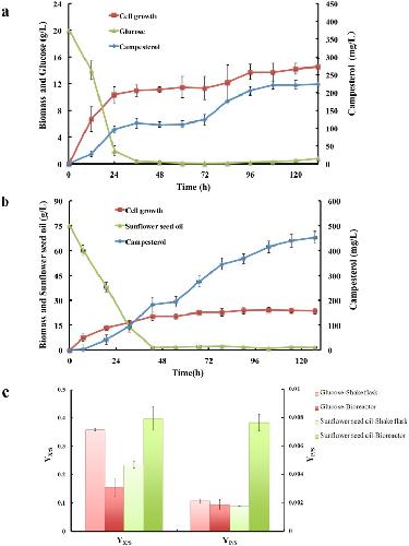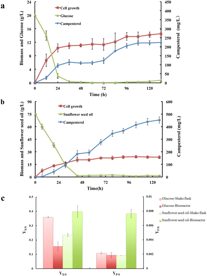 Fig 5. Bioreactor fermentation with different carbon sources.Campesterol producing strain SyBE_Yl1070028 was fed-batch cultured in glucose (a) or in sunflower seed oil (b) with carbon source restriction strategy. YX/S (yield of total biomass produced per unit of substrate consumed) and YP/S (yield of product formed per unit of substrate consumed) for fed-batch bioreactor cultures were compared with those from the shake-flask experiments (c).