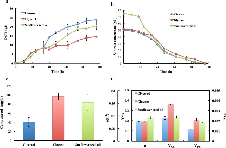 Fig 4. Shake flask cultivation with different carbon sources.(a) Cells growth for Y. lipolytica strain SyBE_Yl1070028 with glucose, glycerol and sunflower seed oil as the carbon source. (b) Substrate (glucose, glycerol and sunflower oil) consumed by strain SyBE_Yl1070028. (c) The final campersterol titers produced by strain SyBE_Yl1070028 with glucose, glycerol and sunflower seed oil as the carbon source. (d) Cells growths specific rate (μ, h-1), biomass conversion yield (YX/S) and campesterol production yield (YP/S) for strain SyBE_Yl1070028 with different carbon source. μ is determined as ln(X/X0)/ (t-t0), where X is for total biomass (g/L) and t is for time (h). Meanwhile, YX/S represents the yield of total biomass produced per unit of substrate consumed and YP/S represents the yield of product formed per unit of substrate consumed.