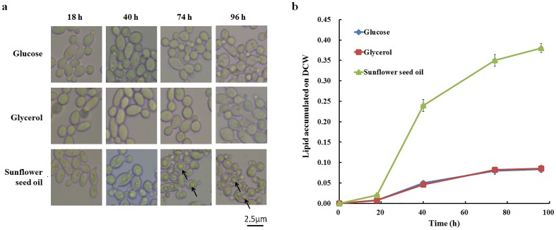 Fig 6. Lipid accumulation in Y. lipolytica strain SyBE_Yl1070028 cultured with different carbon sources.(a) The morphology and the lipid body (indicated by arrows) of the engineered Y. lipolytica strain in shake flask cultivation with glucose, glycerol and sunflower seed oil as the carbon source. (b) The lipid accumulation on the dry cell weight (DCW) basis for the shake flask trials.