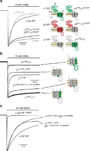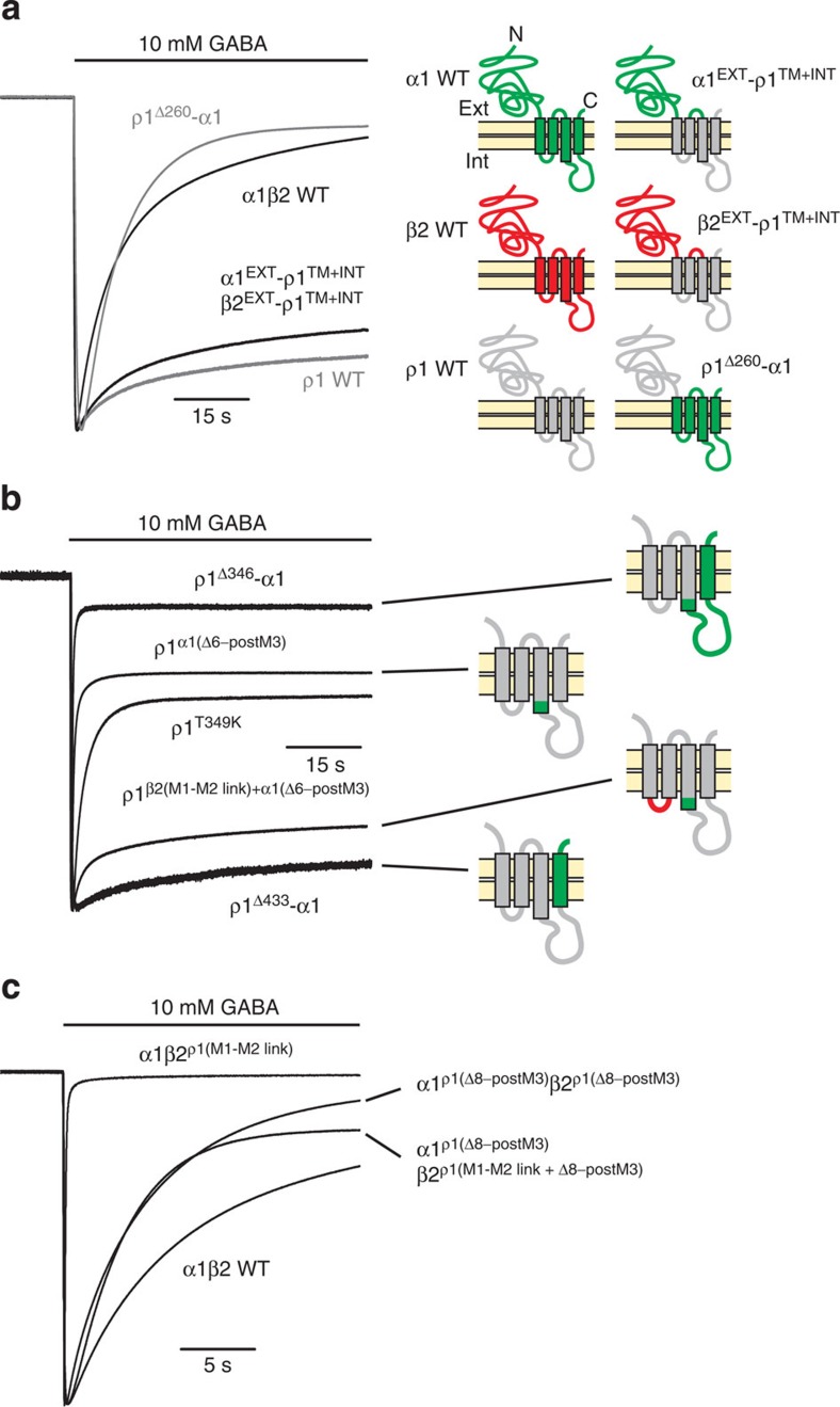 Figure 1. Intracellular end of M3 and the M1–M2 linker control desensitization of GABAARs.(a–c) Peak-scaled membrane currents elicited by 10 mM GABA (black line), showing the desensitization phase for the indicated receptor constructs (left column). The recovery phase is omitted for clarity. See Table 1 for values of τw and extent of desensitization (% Des) in all figures. The subunit chimeras are depicted by a colour code: green (α1), red (β2) and grey (ρ1) (right column). Numbering refers to the position of the interface between the two subunits in the chimera. TM/M, transmembrane domain, INT, intracellular loops.