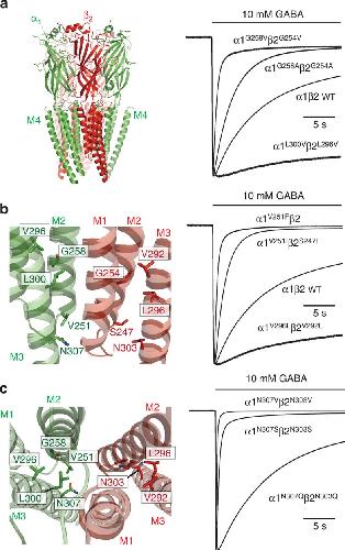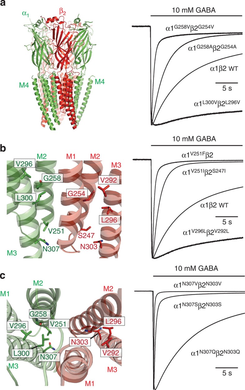 Figure 2. Mutating the intracellular end of the M2/M3 interface regulates desensitization of α1β2 GABAARs.(a) Left: 3D model of an α1β2 GABAAR based on GluCl template. Right in a–c: membrane currents induced by 10 mM GABA. (b) Left: enlarged side view of the intracellular end of the ion channel showing transmembrane domains M1–M3 for α1 (green) and β2 (red) subunits and the positions of various labelled residues. (c) Left: enlarged plan view of the ion channel. Note, in b,c, M4 segments were omitted for clarity.