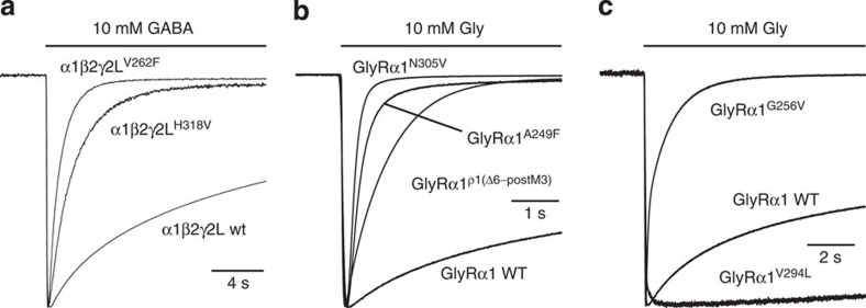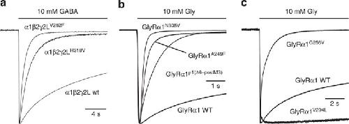 Figure 4. Residues affecting desensitization in heteromeric α1β2γ2 GABAA receptors and homomeric GlyRα1 glycine receptors.(a) Membrane currents activated by 10 mM GABA showing desensitization of γ2 subunit-containing wild-type and mutant GABAA receptors. (b,c) Membrane currents activated by 10 mM glycine, showing desensitization of glycine receptors, both wild type and mutants (see text for details).