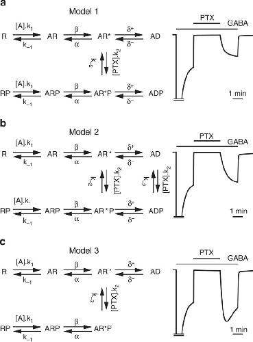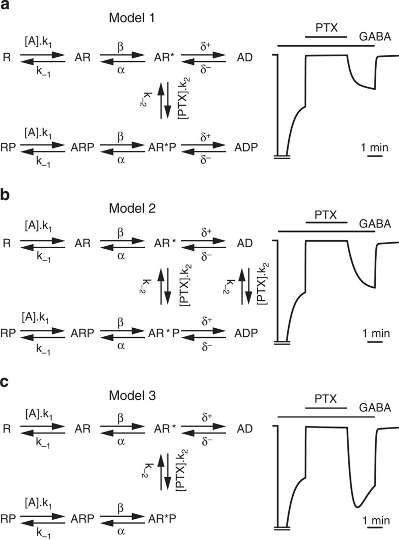 Figure 6. Simulation of GABA currents after block by and recovery from PTX.(a–c) Left: kinetic models 1–3 used to predict the recovery of agonist-induced currents after wash-out of PTX (or P) in the presence of saturating concentrations of the agonist ([A]; 10 mM GABA). Receptors states are: R inactive, agonist-unbound receptor; AR inactive, agonist-bound receptor; AR* agonist-bound activated receptor; AD agonist-bound desensitized receptor, all with or without bound PTX. Right: predicted membrane currents, generated from the models, for wild-type α1β2 GABAARs activated by 10 mM GABA in the presence and absence of 50 μM PTX. See Supplementary Table 2 for the numerical values of the parameters. (a) Model 1: the PTX-blocked open receptor (AR*P) can desensitize, but PTX binding and unbinding cannot occur to or from either the resting (R/RP, AR/ARP) or desensitized (AD/ADP) receptor states. (b) Model 2: PTX binding and unbinding is permitted to both open (AR*/AR*P) and desensitized states. (c) Model 3: PTX binding prevents desensitization (that is, there is no ADP state).