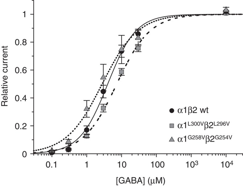 Figure 3. Effects of mutations α1L300Vβ2L296V and α1G258V β2G254V on GABA sensitivity.GABA concentration–response curves for wild-type (wt) α1β2 (EC50=4.1±0.7 μM, nH=1.08±0.07, n=6), α1L300Vβ2L296V (EC50=7.3±0.9 μM, nH=0.91±0.02, n=5) and α1G258V β2G254V receptors (EC50=3.0±0.9 μM, nH=0.89±0.19, n=5). Error bars are s.d.