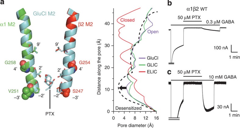Figure 5. Promoting desensitization of GABAARs causes fast dissociation of the pore blocker PTX.(a) Left: side-view cutaway section through the transmembrane domains showing two (α1—green, β2—red) of the five M2 helices from our α1β2 GABAAR model overlaid with the M2 helices of the PTX-bound GluCl structure (light blue; pdb 3RI5 (ref. 14)). Note the deep location of the PTX-binding site between locations 2′ and −2′. Right: predicted pore diameter plotted as a function of the distance along the pore axis for GluCl, GLIC (open; pdb 3EAM (ref. 18)) and ELIC (shut; pdb 2VL0 (ref. 19)). This is vertically aligned with the left panel schema for cross comparison. The dashed line reflects the hypothesis that desensitization is an extension of the activation process, leading to a desensitization gate located between positions −3′ and 4′. (b) Representative membrane currents showing slow dissociation of PTX from α1β2 GABAARs when activated by a low concentration of GABA (0.3 μM, n=6). (c) Membrane currents showing fast dissociation of PTX from α1β2 GABAARs activated by saturating concentrations of GABA (10 mM, n=5). Note the peak currents are truncated for clarity.