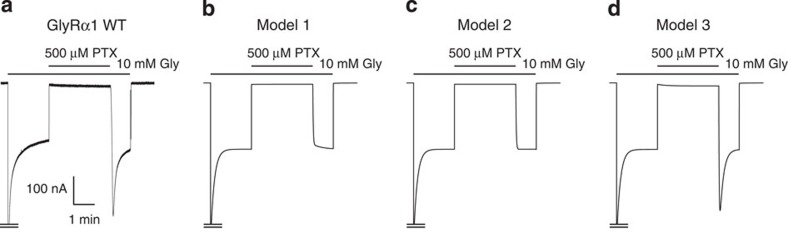Figure 7. GlyR current recovery after blockade by PTX under desensitizing conditions.(a) Representative recording of the fast dissociation of PTX from GlyRα1 activated by high concentrations (10 mM) of glycine, accompanied by a clear rebound current (n=5). (b–d) Predicted membrane currents for activated wild-type GlyRα1 using the kinetic models 1–3, respectively, described in Fig. 6. See Supplementary Table 2 for the numerical values of parameters. Note, peak currents are truncated for clarity.